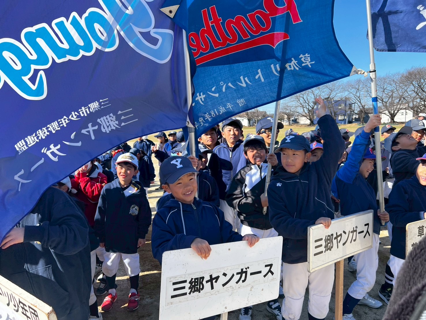 たくさんのチームと野球が出来ることを感謝して、全力プレーすることをたなびく団旗に誓って記念写真!